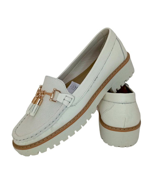 Mocasines Elegantes para Dama en Cuero Beige y Dorado - Modelo 2408